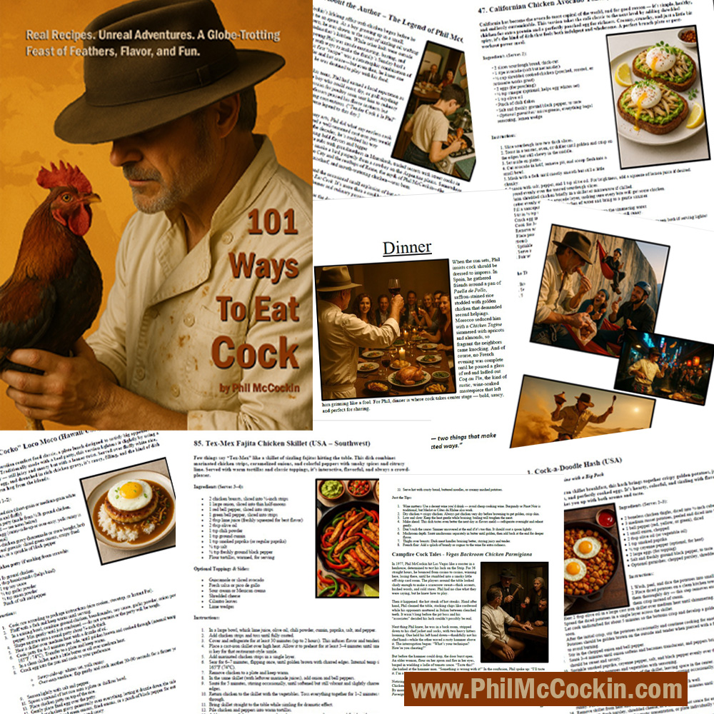 Phil McCockin has never played it safe in the kitchen—or in life. With a spatula in one hand and a passport in the other, he has traveled across every continent chasing the boldest flavors. He seeks the juiciest chicken recipes the world has to offer. Along the way, he’s cooked alongside Michelin-starred chefs and swapped secrets with street vendors. Furthermore, he’s learned a trick or two from grandmothers who don’t measure, but always know when “it’s done.” Phil’s debut cookbook, 101 Ways to Eat Cock, is the culmination of years of adventure, flavor-hunting, and tongue-in-cheek storytelling. Each recipe is served with a wink, a nudge, and just enough innuendo to make you laugh while you lick your fingers. From fiery curries to sticky glazes, smoky grills to silky braises, his cock (yes, the chicken) has never tasted better.